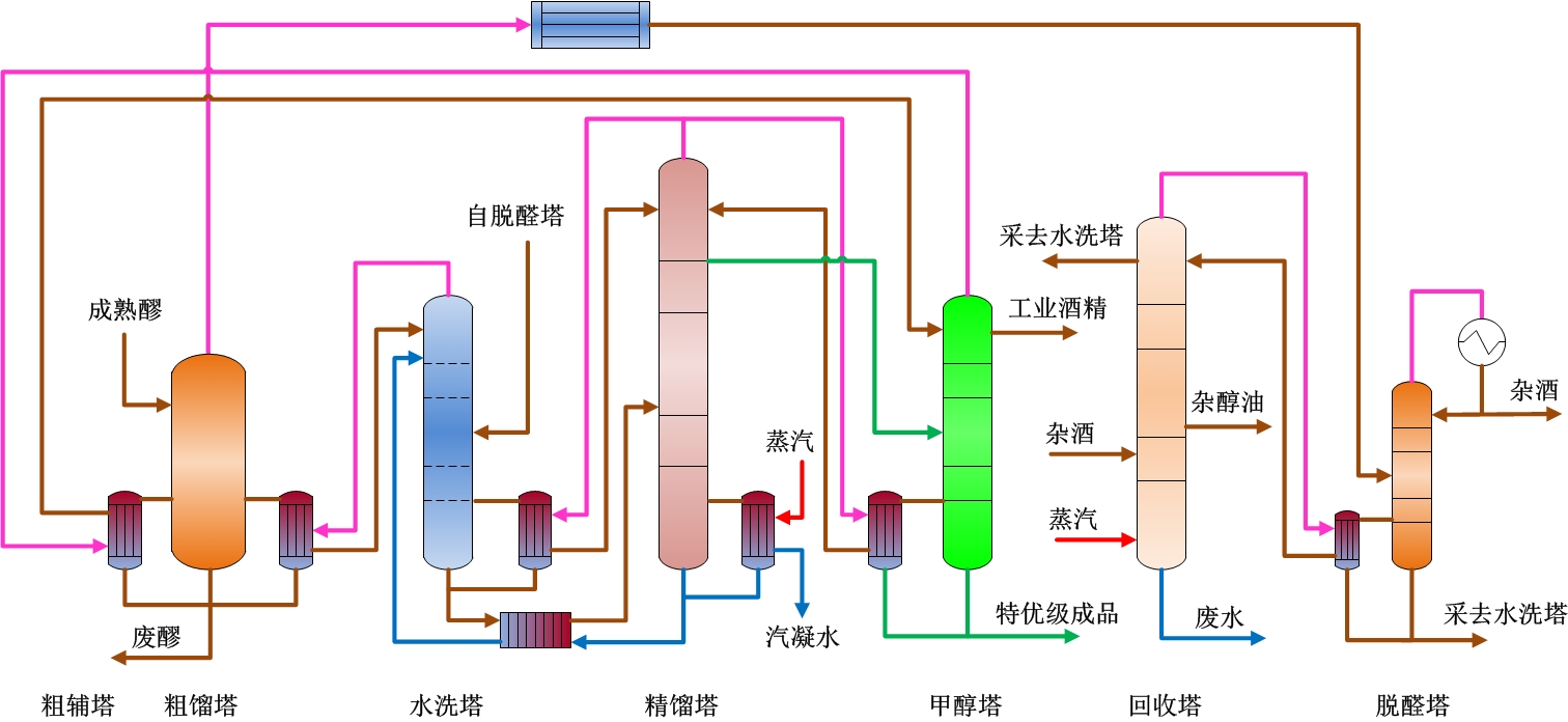 配置粗餾塔、水洗塔、精餾塔、甲醇塔、回收塔、脫醛塔,其中精餾塔采用蒸汽供汽,精餾塔塔頂酒汽供熱水洗塔和甲醇塔,水洗塔和甲醇塔塔頂酒汽供熱粗餾塔,回收塔塔頂酒汽供熱脫醛塔,粗餾塔和脫醛塔塔頂酒汽預(yù)熱成熟醪。